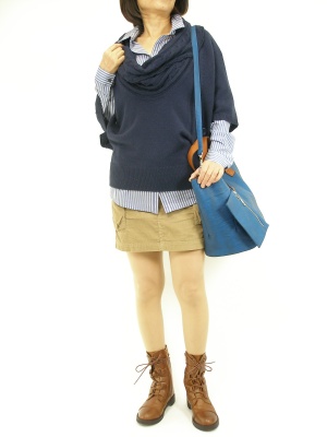 ゆるニットにシャツの定番コーディ。ポイントはストライプのシャツでマニッシュに。明るい色のコンパクトボトムスでアクティブな装いに!アクティブ度90%、スタイリッシュ度10%。