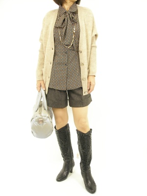 シャツの柄とカーディの色をリンクさせて、でも素材感はあえて合わせないのがお洒落に見せるコツです!フェミニン度60%、アクティブ度40%。