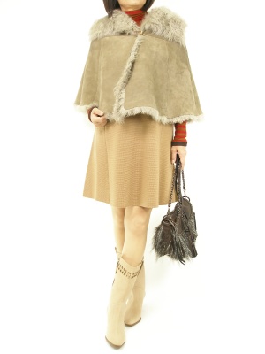 ムートンケープをニットワンピでデイリーにカジュアルダウン。ブラウンに赤を足すとアクティブな雰囲気を増しますね!フェミニン度90%、アクティブ度10%。