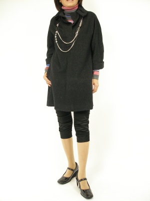 濃い目のグレーにはピンク系の色が良く似合いますね。黒のレギンスで引き締めるとスッキリ可愛いスタイルの完成です!フェミニン度80%、スタイリッシュ度20%。