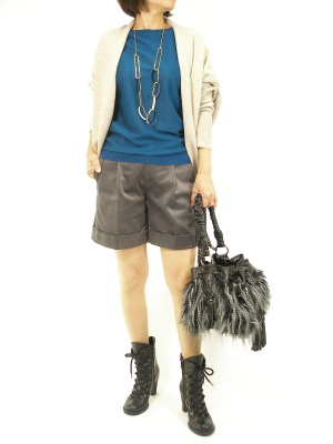 ボーイッシュなスタイルもキレイ色のニットと丸いシルエットのカーディでフェミニンな印象に!フェミニン度60%、アクティブ度40%。