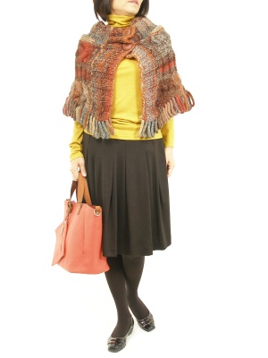 ミックスツイードのニットケープは暖かさのある色合いで、からし色とのバランスがとても良いですね!フェミニン度70%、エレガンス度30%。