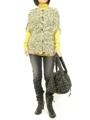 真冬が待ち遠しくなるローゲージニットのポンチョ。イエローを差し色にコーディロイパンツと合わせた暖ったかコーディがお薦め!アクティブ度90%、フェミニン度10%。