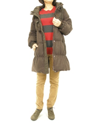 個性的なダウンはシンプルコーディで十分可愛い。赤のニットが冬らしい差し色に!アクティブ度100%。