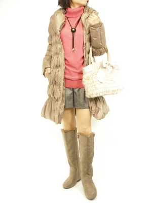 ダウンのインナーはキレイ色で決まり。クラシカルなループタイがアクセントになりますね!フェミニン度80%、アクティブ度20%。