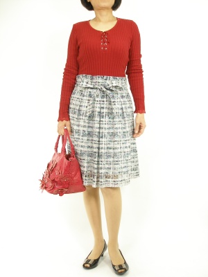 柔らかな素材の柄スカートは、メリハリのある赤のニットと合わせてポップな春のイメージに!フェミニン度80%、スタイリッシュ度20%。