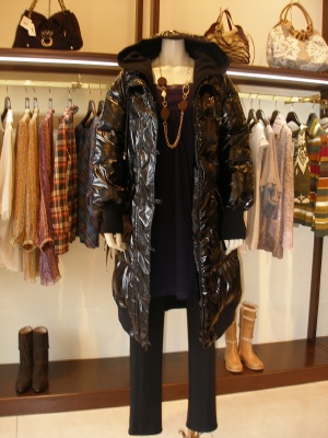 インパクトのあるダウンコートでセレブカジュアルっぽく。あえてインナーは薄手で胸元を開けるのがポイントです!アクティブ度60%、スタイリッシュ度40%。