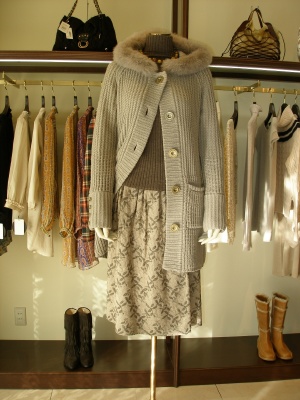 アースカラーでまとめた控え目なコーディネート。でもよく見るとフードのファーやスカートの刺繍がさりげなく自己アピールしてますよ!フェミニン度100%。
