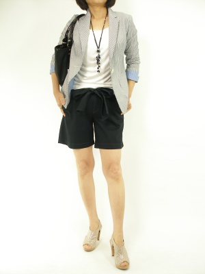緩いショートパンツは、春らしいコードレーンのジャケットで合わせる。足元は流行りのサンダルをプラスして!スタイリッシュ度90%、エレガンス度10%。