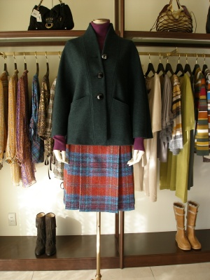 優等生的なチェックのスカートは、今年らしいケープ風のジャケットを合わせると新鮮。フェミニン度90%、アクティブ度10%。