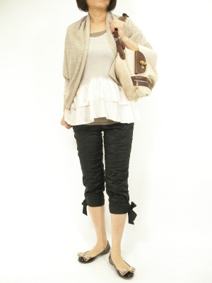 トップスをふんわりまとめたら細身のパンツで引き締めて。でも裾のリボンで可愛らしさも忘れずに!フェミニン度60%、スタイリッシュ度40%。