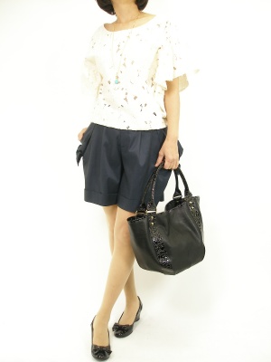 レースのトップスにリボンのパンツで甘口のコーディネート。シックな色でまとめて大人可愛く!フェミニン度90%、スタイリッシュ度10%。