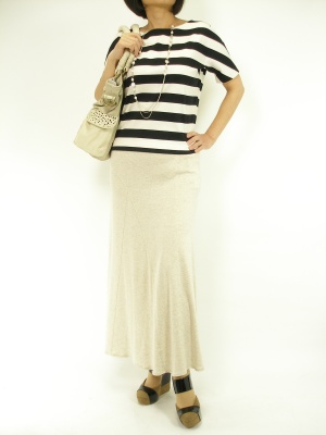 流行りのロングスカートはショート丈トップスを合わせるのがバランス良い。小柄さんにはヒールサンダルを合わせて!スタイリッシュ度60%、アクティブ度40%。