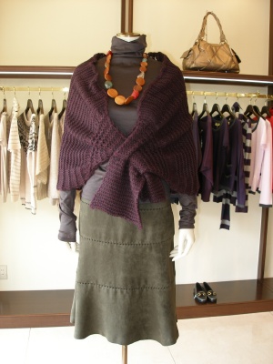 ノスタルジックな肩掛けストールは秋の雰囲気に満点です。フェミニン度80%、アクティブ度20%。