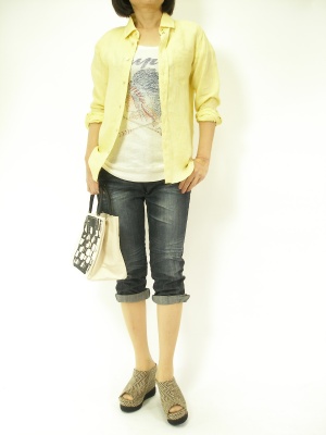 イエローのシャツをさらっとTシャツに合わせるだけでアウトドアに行きたくなりますね!アクティブ度90%、フェミニン度10%。