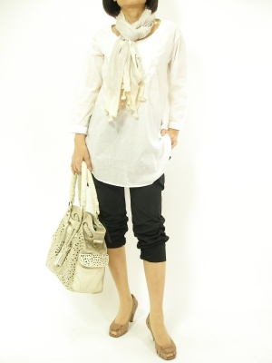 ナチュラル系チュニックもストールと細身カーゴでスタイリッシュな印象に!スタイリッシュ度70%、アクティブ度30%。