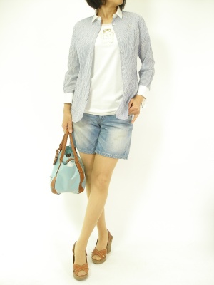 デニムのショートパンツにTシャツだけだと子供っぽいので、サラリとシャツを羽織って!アクティブ度90%、フェミニン度10%。