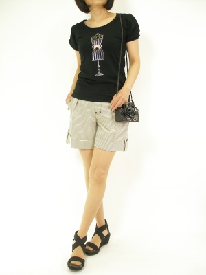 パフスリーブのTシャツにお花のミニバッグ・・。甘口アイテムはモノトーンでまとめるのがお洒落!フェミニン度70%、スタイリッシュ度30%。