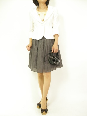 ふんわりスカートも地味色にするだけで大人可愛くなりますね。白のジャケットでウエストを押さえてバランスよく着こなして!フェミニン度80%、エレガンス度20%。