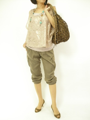 個性派ブラウスとゆるパンツで作る大人のリラックススタイル。程よい肌見せがポイントです!スタイリッシュ度80%、アクティブ度20%。