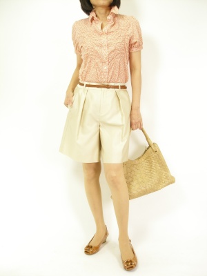 小花柄や光沢素材を選べばシャツとパンツのコーディもフェミニンに!フェミニン度70%、スタイリッシュ度30%。