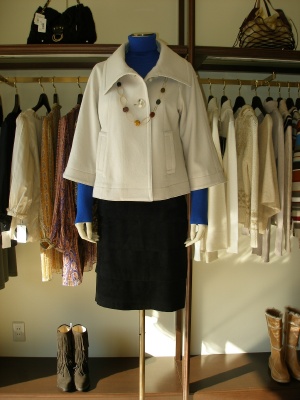 短いコートJKは室内でもそのまま着ていられるので便利です。車の乗り降りの多い方にはぴったりですね!スタイリッシュ度70%、フェミニン度30%。
