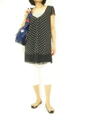 モノトーンコーディもこんなドット柄ワンピならフェミニンな雰囲気。夏の黒はかえって涼しげに見えますよ!フェミニン度70%、スタイリッシュ度30%。
