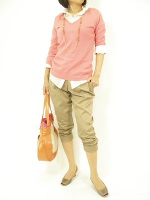 Vネックニットにインする白シャツを透け感のあるタイプにすると、ちょっと力の抜けたこなれたスタイルになります!スタイリッシュ度70%、フェミニン度30%。