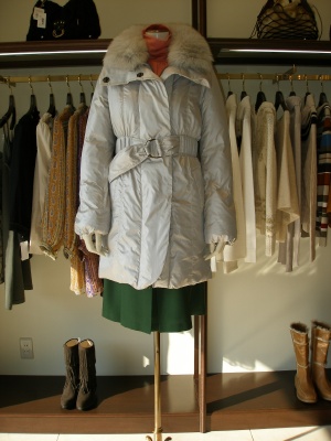 シルバーグレーが上品なダウン。インナーは少ししか見えないので思いきって明るい色を!フェミニン度90%、スタイリッシュ度10%。