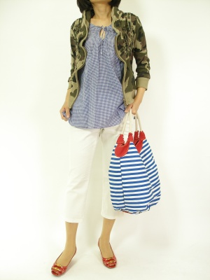 トリコロールカラーでまとめたスタイルに迷彩を投入して、ひと癖加えてみました!アクティブ度90%、フェミニン度10%。