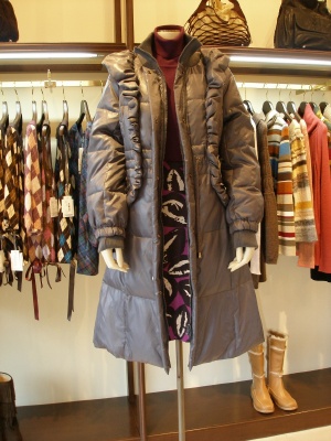 流行りのパープルはライトグレーと合わせると上品です。ダウンでもエレガントに!エレガンス度70%、スタイリッシュ度30%。