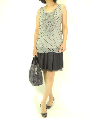 甘口アイテムどうしのコーディネートはトップスをノースリーブにするとスッキリまとまります!エレガンス度60%、フェミニン度40%。