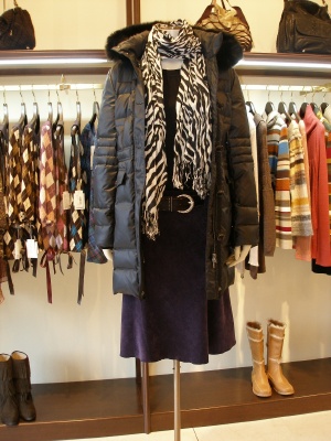 黒のニットにはストールがセットされています。ダウンはやや甘口テーストですが、スカート、パンツどちらでも使えて通勤にも重宝しますよ!スタイリッシュ度70%、フェミニン度30%。