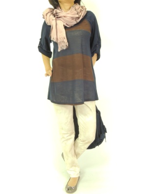 太ボーダーのゆるトップスはタイトなパンツとストールでバランスを取って!アクティブ度100%