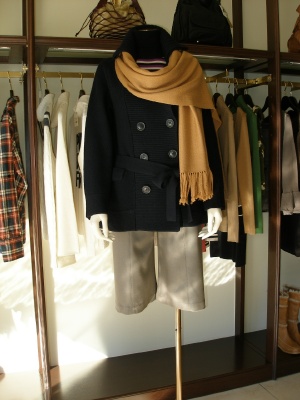 ピーコート風のニットとインナーのボーダーで冬のマリンスタイル。車での通勤なら、こんなニットのアウターが便利です!