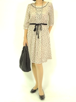 ドット柄のワンピースは清楚で可愛いイメージ。2つセットのネックレスは一つだけで使用しています!フェミニン度70%、エレガンス度30%。