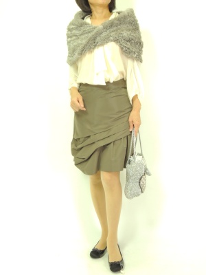 ブラウスとスカートのキレイ目エレガントスタイルもファースヌード投入で旬の表情に!エレガンス度70%、フェミニン度30%。