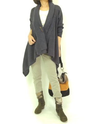 ボリュームのあるざっくりニットは、この秋冬一押しのアイテム。細コールのタイトなパンツでスッキリまとめるのがお薦めです!スタイリッシュ度80%、アクティブ度20%。
