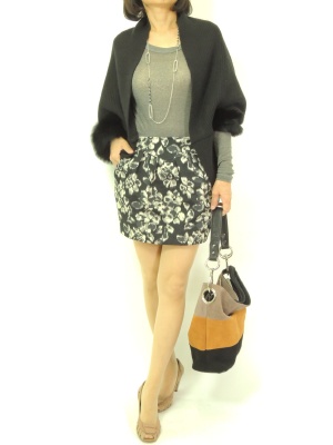 ファー付きのボリュームカーディにスカートを合わせるなら、思いきったミニ丈がお洒落です!スタイリッシュ度80%、エレガンス度20%。