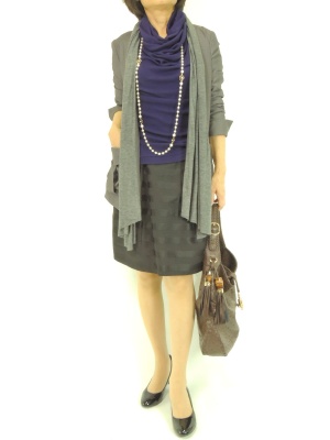 ストールを垂らしたようなジャケットが甘口スカートをクールに見せます!スタイリッシュ度70%、アクティブ度20%。