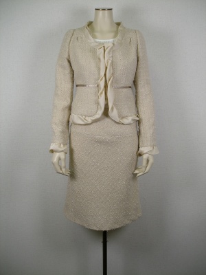 ライトベージュの甘口スーツで入園、入学式でも好印象。デコラティブなジャケットなのでスカートは控えめなAラインです!