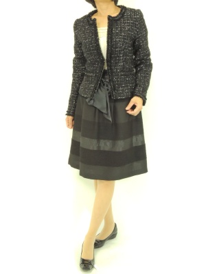 ツイードジャケットと広がるスカートのエレガントなお出かけスタイル。キーポイントは「素材感」です!エレガンス度90%、フェミニン度10%。