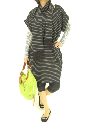 ワンピースのボーダーとピッチの違うボーダーのカットソーをインした遊び心のある着こなし!アクティブ度90%、スタイリッシュ度10%。