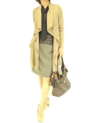 落ち感のあるドレープカーデとタイトスカートでIラインにまとめた甘さ控えめな通勤スタイル!スタイリッシュ度80%、エレガンス度20%。