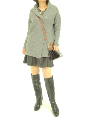 ニットとフェイクレザーの異素材MIXで楽しむ冬ならではのコーディネート。フレアスカートならフェイクレザーも可愛い印象です!フェミニン度60%、スタイリッシュ度40%。