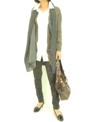 重ね着風のトップスはスッキリしたシルエットが魅力です。ストールとスキニーパンツでさらに縦長効果を狙って!スタイリッシュ度100%。