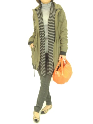 ボーダーのストールを合わせたような変り種デザインのリバーシブルコート。シックな色合いなので、ボーダー×チャックも大人っぽく決まります!アクティブ度70%、スタイリッシュ度30%。