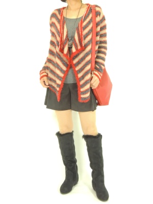 赤を効かせた冬らしい着こなし。冬素材ですが、薄手なのですぐにお召いただけます。バッグはインバッグを使用しています!フェミニン度60%、スタイリッシュ度40%。