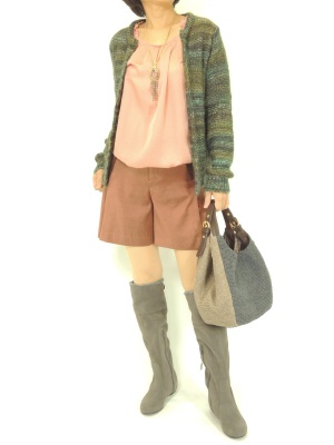 ナチュラル系ニットカーデは艶のあるブラウスと合わせて綺麗目に着るのも可愛い!フェミニン度70%、アクティブ度30%。