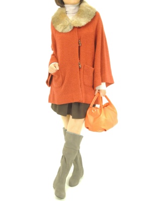 ゆたっりしたコートはショート丈のボトムスですっきり着こなして。丸いファー襟が大人可愛い雰囲気です!フェミニン度90%、アクティブ度10%。